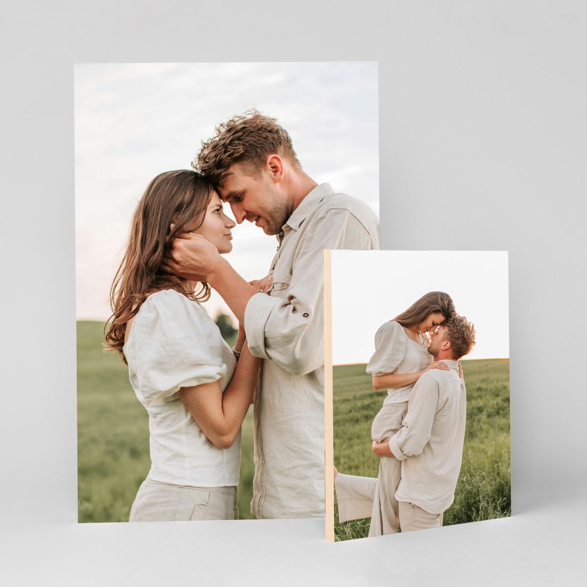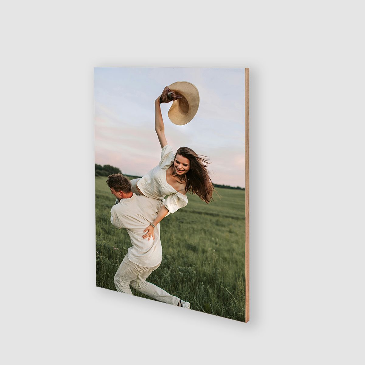 Each print is unique with a natural wood surface, showcasing the wood grain through white and light areas. Perfect for outdoor and natural light images, including portraits and weddings.