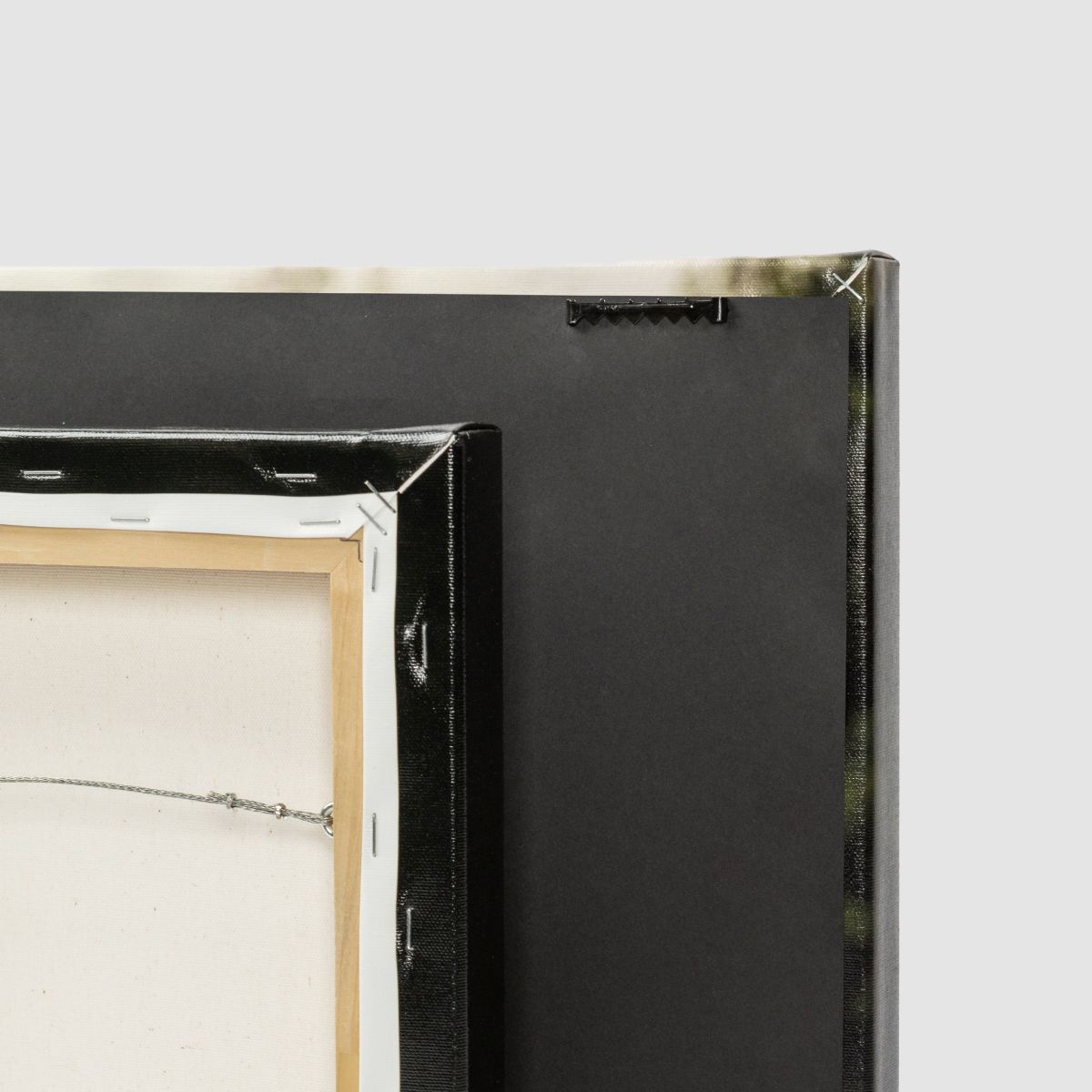 Custom collages featuring family portraits, wedding moments, or landscapes are printed on Premium Fine Art Canvas using Epson archival inks. The canvas is available in 1½" wrap depths with a semi-gloss laminate for protection against UV light and scratches. Canvases include sawtooth hangers for small sizes and wire hangers with craft paper backing for larger sizes.